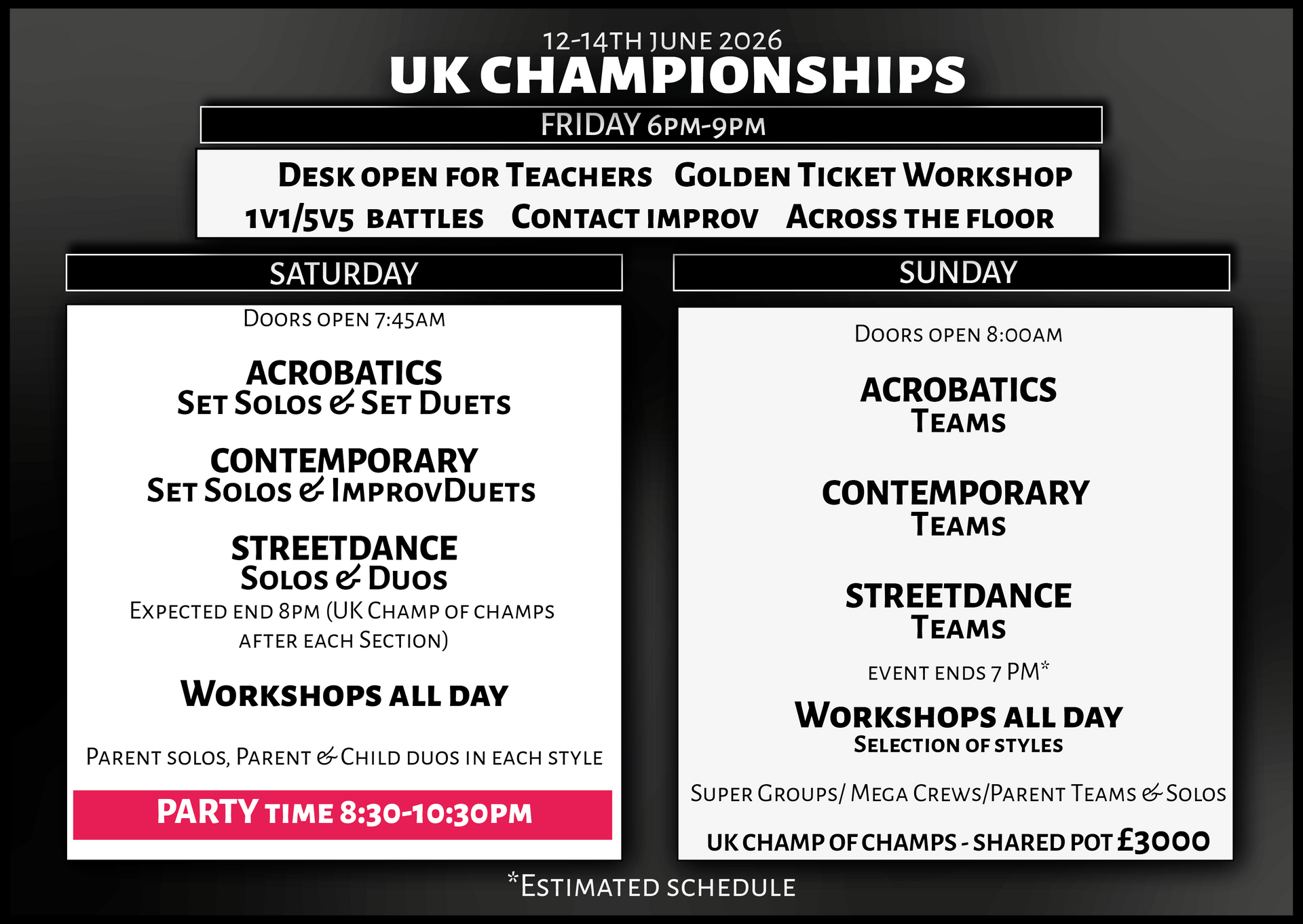 - Workshops: Included for dancers, schedule released two weeks prior